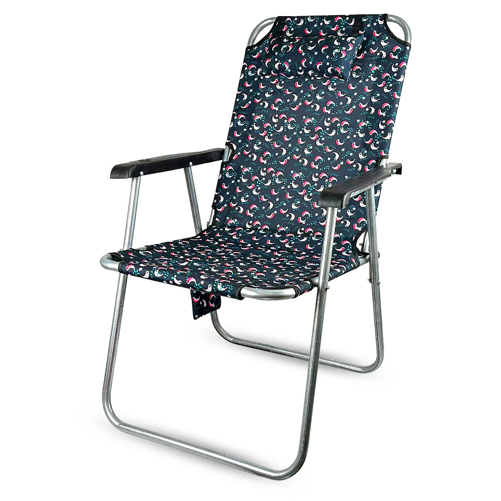 Structure en acier galvanisé anti-rouilleAssise et dossier en tissu résistantCoussin repose-tête intégréAccoudoirs solides en plastiquePliable pour un transport et un rangement facilesIdéale pour le camping, la plage ou le jardinDimensions approximatives :