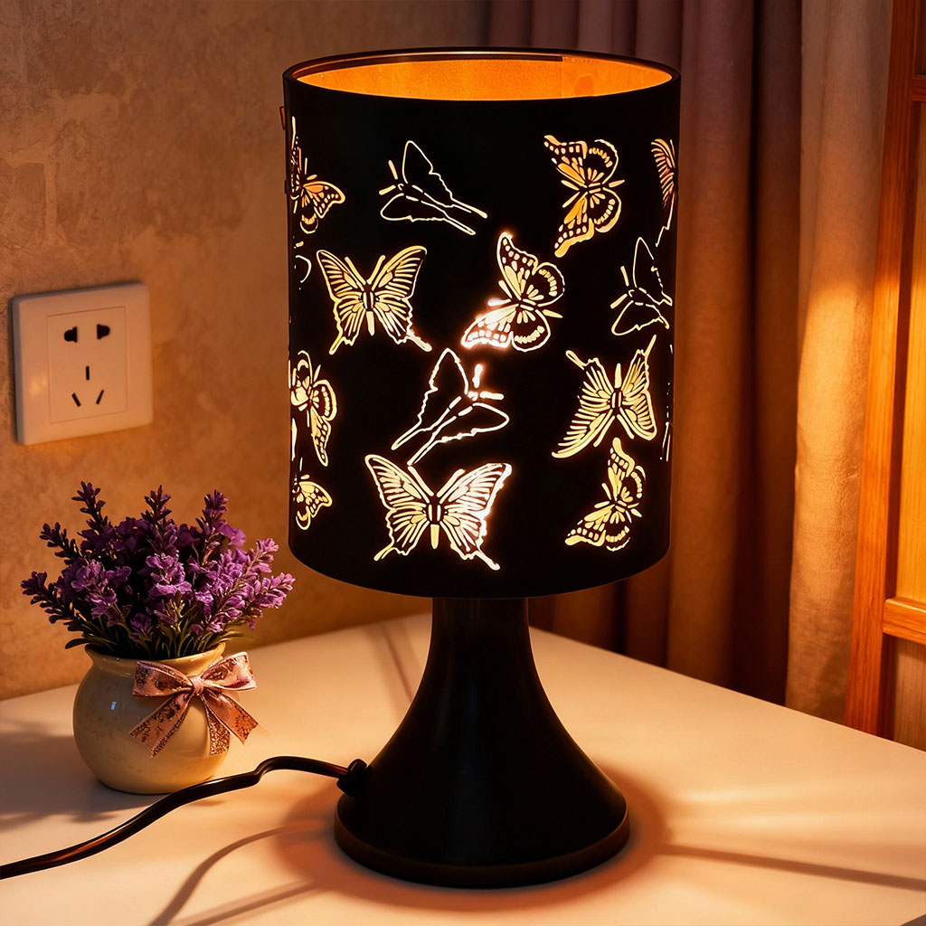 🌙✨ أضف لمسة شاعرية إلى منزلك بهذه المصباح الزخرفي الأنيق، المزود بغطاء أسود مزخرف بشكل فراشات 🦋.