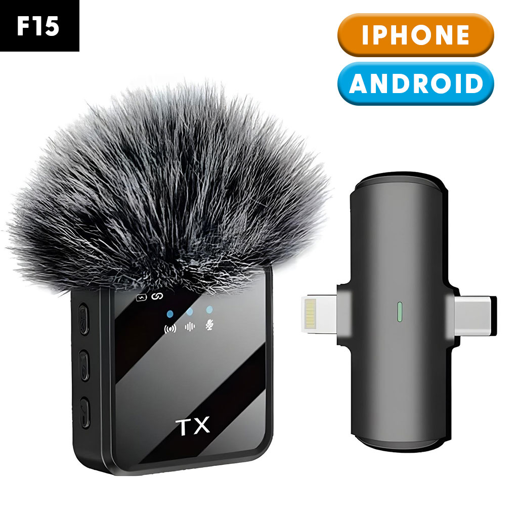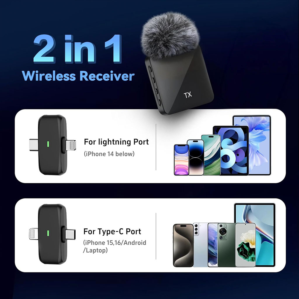 ميكروفون لاسلكي احترافي 2 في 1 يعمل مع iPhone وAndroid لتسجيل صوت نقي وسهل في أي وقت.