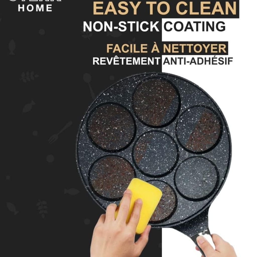 Conception à 7 Moules : Cette poêle est dotée de sept empreintes, idéales pour préparer simultanément des pancakes, blinis ou œufs uniformes et parfaitement ronds.Revêtement Antiadhésif : Assure une cuisson sans accroche et facilite le nettoyage, vous permettant de cuisiner avec moins de matières grasses.Compatibilité : Conçue pour une utilisation sur les cuisinières à gaz, offrant une distribution uniforme de la chaleur pour une cuisson optimale.Dimensions : Avec un diamètre de 9,7 pouces (environ 24,6 cm), cette poêle offre une surface suffisante pour préparer un petit-déjeuner copieux pour toute la famille.Matériau Durable : Fabriquée en aluminium de haute qualité, elle garantit une longue durée de vie et une résistance à la déformation.