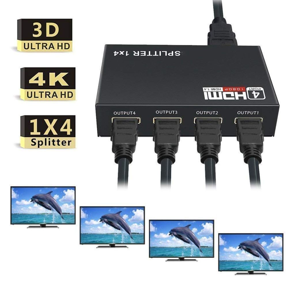 Le splitter HDMI VKBAND 1x4 permet de connecter une source HDMI unique, telle qu'un décodeur, un lecteur DVD, un ordinateur portable, une console PS3, PS4, XBOX ou tout autre appareil HD, à quatre écrans simultanément. Chaque écran affichera le même contenu en haute définition, facilitant ainsi les présentations, les configurations multi-écrans ou le partage de contenu dans différents espaces.