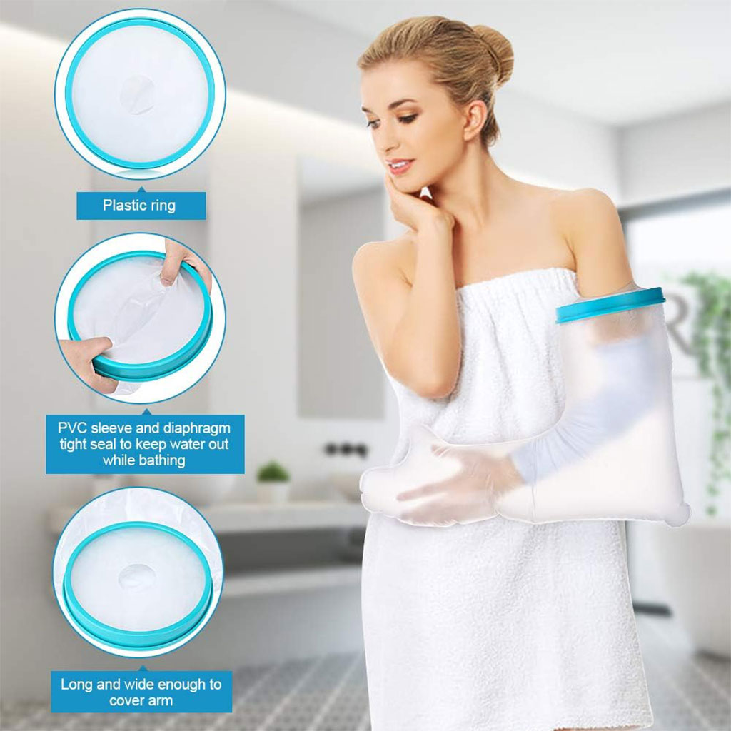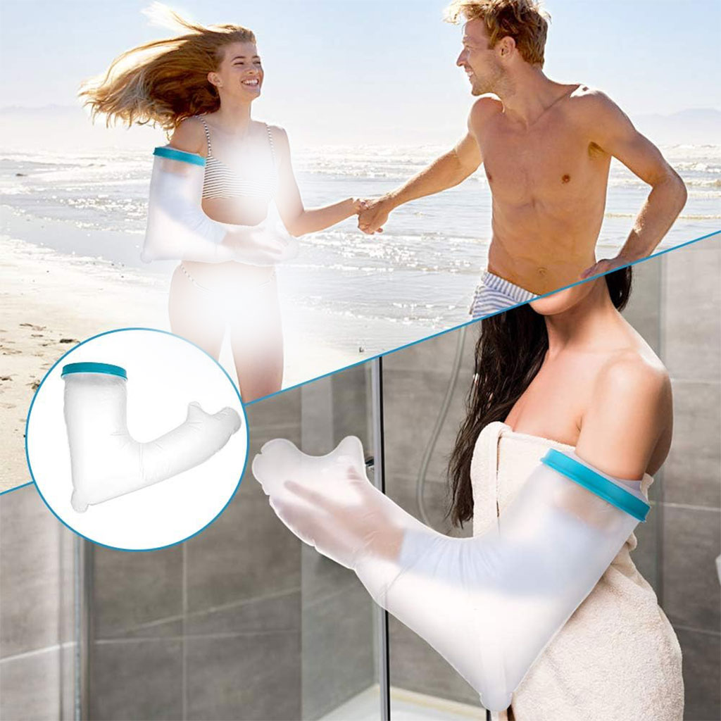 بطول 60 سم، يغطي الذراع بالكامل، مما يجعله مثاليًا لحماية الأصابع والذراع. مصنوع من مادة خفيفة، صحية وقابلة للغسل، لا تلتصق بالذراع. الفتحة المركزية المرنة، التي يمكن أن تمتد حتى 15 سم قطرًا، واسعة بما يكفي لمرور الجبيرة، وفي الوقت نفسه محكمة بما يكفي لمنع تسرب الماء.